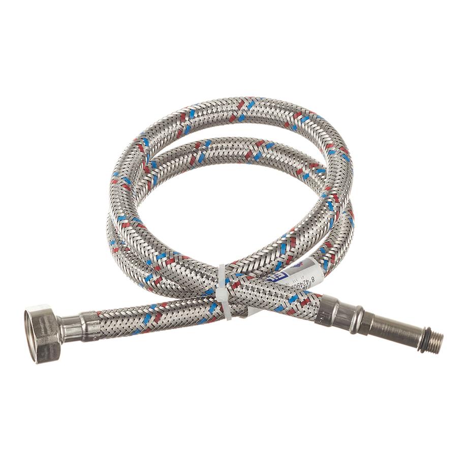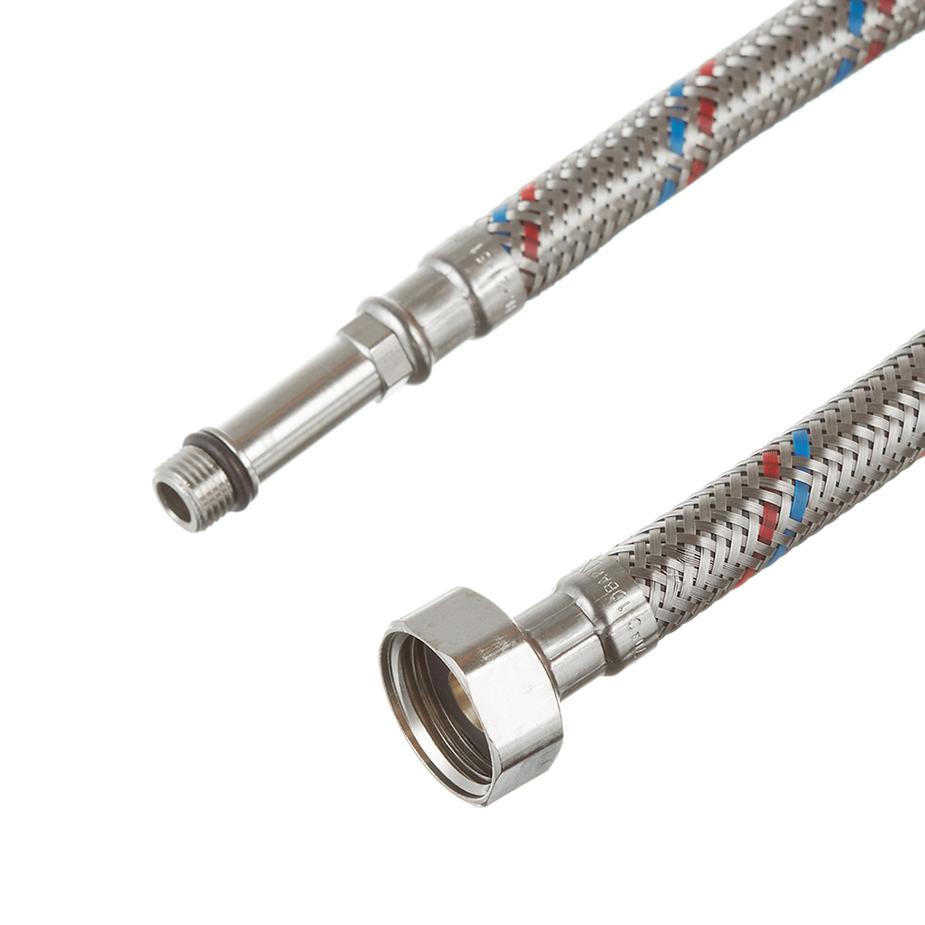 Подводка тонкий штуцер М-(10*1*35) Х 1/2 " 80 см. MATEU длинный. Предназначена для монтажа сантехнической арматуры и приборов сантехнического назначения, подводки воды к приборам бытового назначения. Не предназначена для применения в постоянном проточном режиме, вместо трубопроводов. Состав Резиновый шланг (EPDM) в оплетке из нержавеющей стали AISI 304, гайки, ниппель и штуцер – латунь. Комплектация Подводка, резиновые прокладки. Расшифровка маркировки 80 см – длина подводки, 1/2″ – диаметр условного прохода (16 мм), M10 – метрическая резьба 10 мм