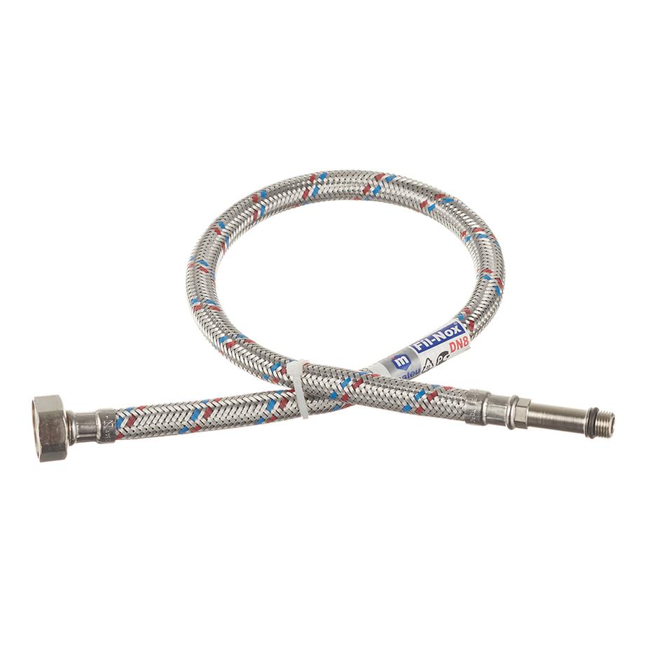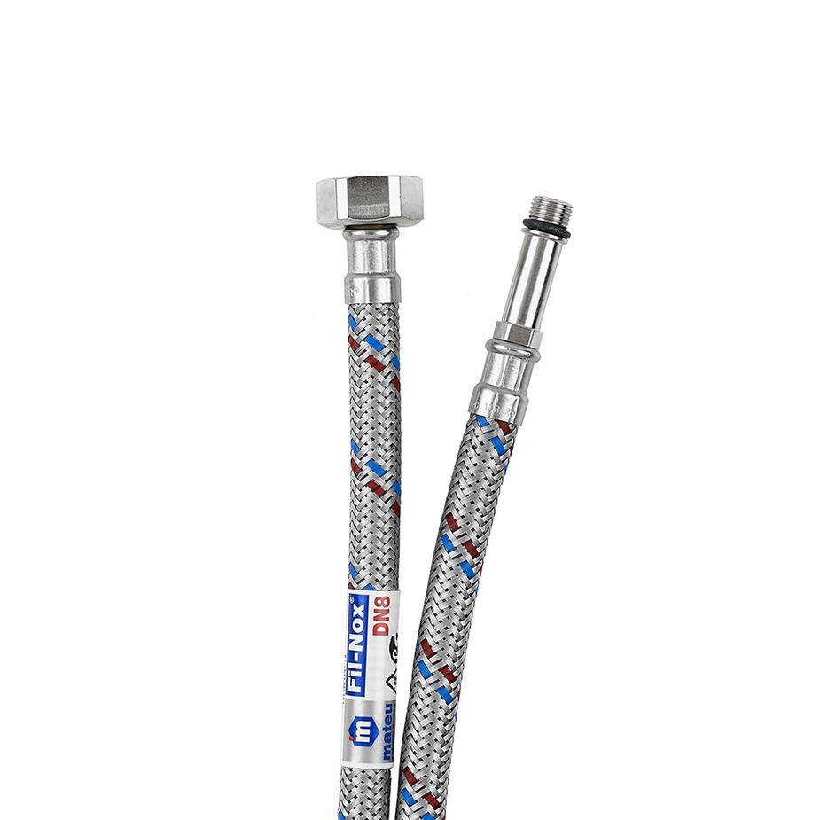 Резиновый шланг (EPDM) в оплетке из нержавеющей стали AISI 304, гайки, ниппель и штуцер  – латунь.