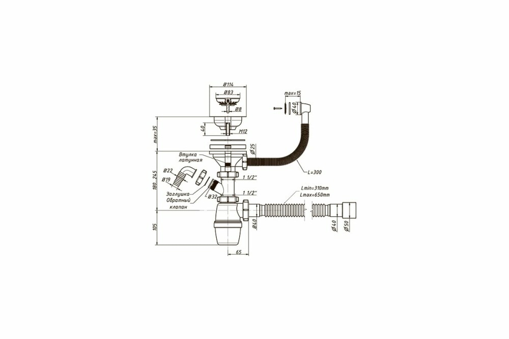Сифон с большим корпусом и отстойником, выпуском с нержавеющей чашкой D-114мм, переливом, отводом для слива от стиральной машины и гибкой трубой 40-40/50, для мойки с круглым переливом