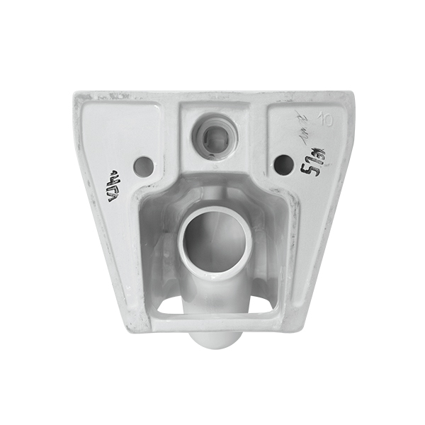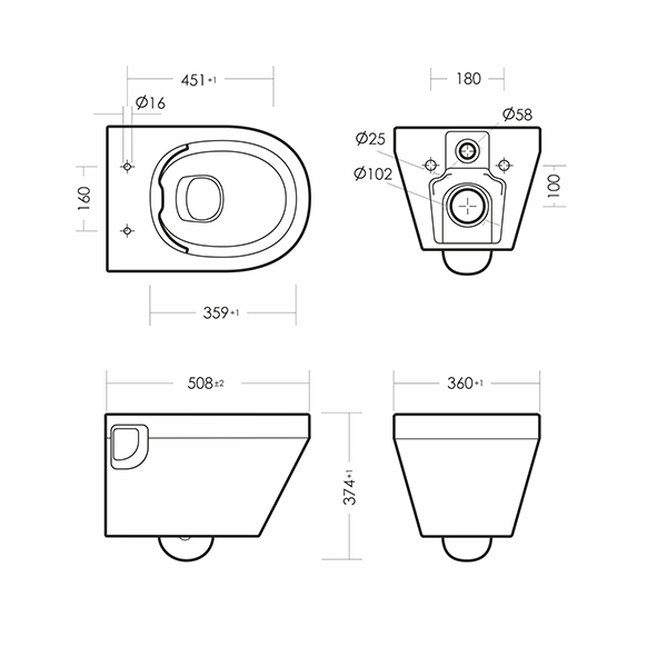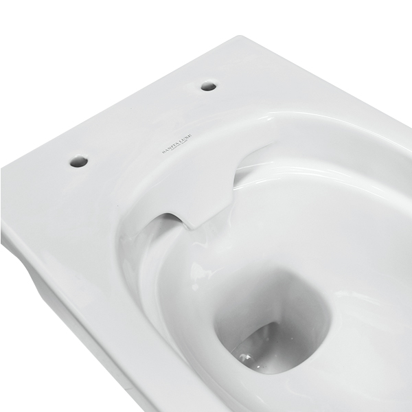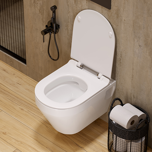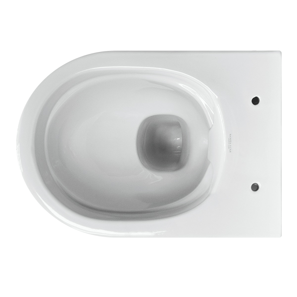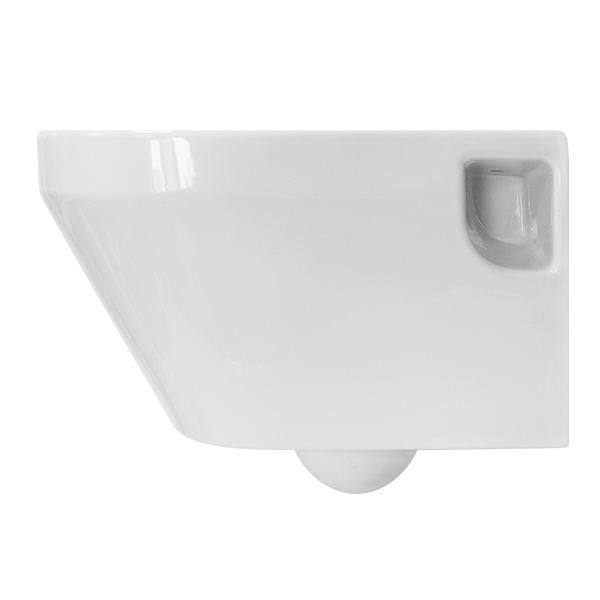 Подвесной безободковый унитаз с горизонтальным ребром по внешней поверхности. В комплекте тонкое быстросъемное сиденье из дюропласта подчеркивающее строгую форму унитаза