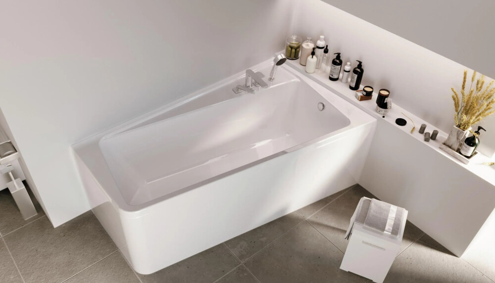Ассиметричная ванна, которая благодаря нестандартному положению купели превращается в полноценный уголок для комфортных ванных процедур, доставляющих настоящее удовольствие.  Дизайн, в основе которого лежит четкая геометрия, будет особенно актуален в современных и эклектичных ванных комнатах.