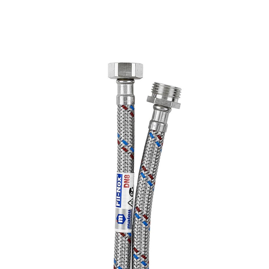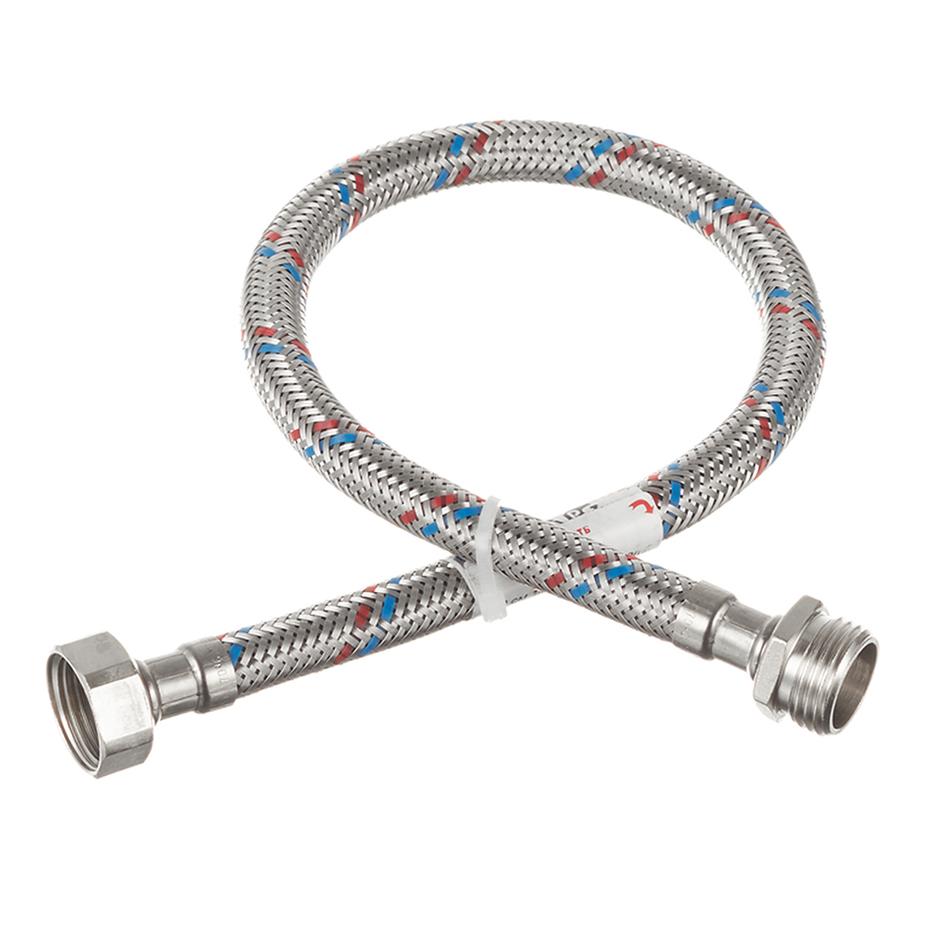 Гибкая подводка для воды 1/2 " гайка-штуцер 50 см MATEU, арт 701050001. Предназначена для монтажа сантехнической арматуры и приборов сантехнического назначения, подводки воды к приборам бытового назначения. Не предназначена для применения в постоянном проточном режиме, вместо трубопроводов. Состав резиновый шланг (EPDM) в оплетке из нержавеющей стали AISI 304, гайки, ниппель и штуцер – латунь. Комплектация подводка, резиновые прокладки. Расшифровка маркировки 50 см – длина подводки, 1/2″ – диаметр условного прохода (16 мм), в/р – 1 проход с внутренней резьбой, н/р – 1 проход с наружной резьбой.