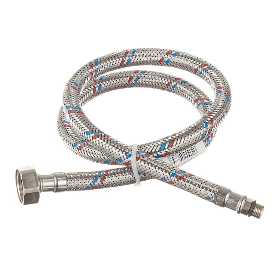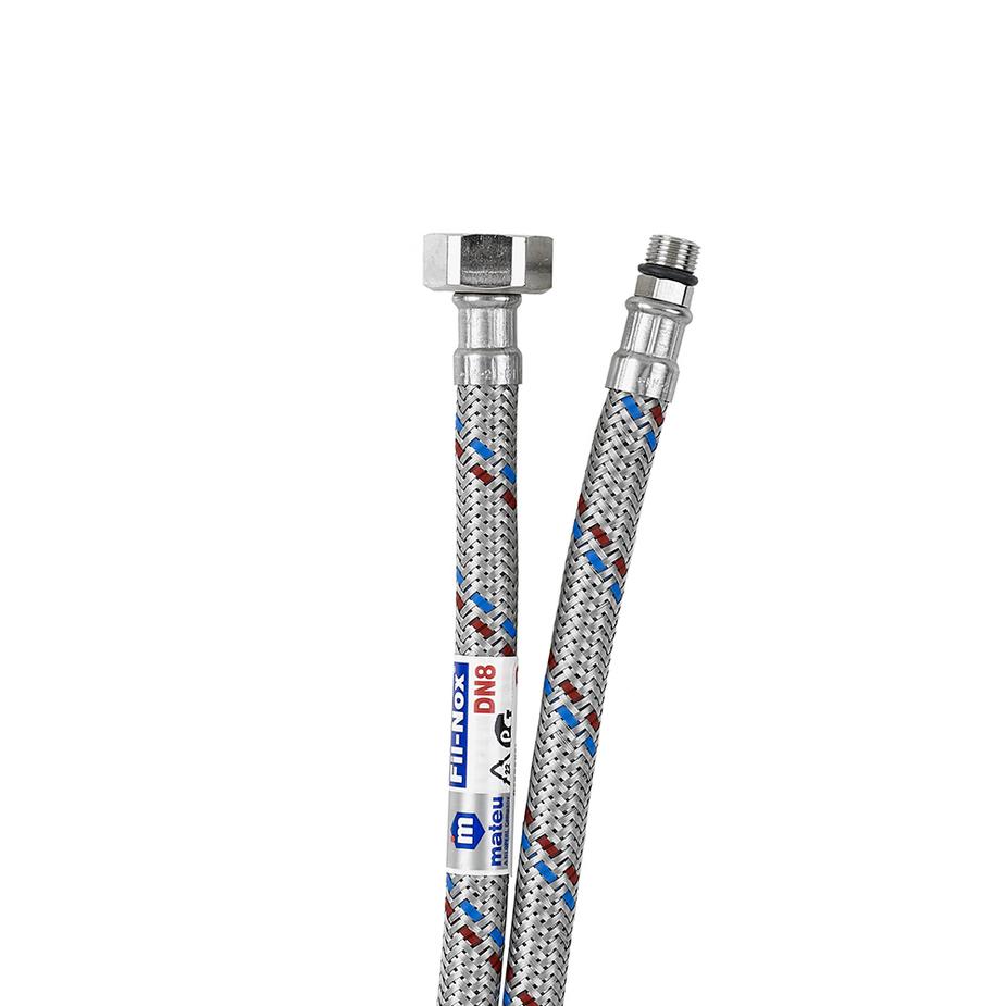 Подводка тонкий штуцер М-10 Х 1/2 " 80см MATEU короткий, арт 721080085. Предназначена для монтажа сантехнической арматуры и приборов сантехнического назначения, подводки воды к приборам бытового назначения. Не предназначена для применения в постоянном проточном режиме, вместо трубопроводов. Состав Резиновый шланг (EPDM) в оплетке из нержавеющей стали AISI 304, гайки, ниппель и штуцер – латунь. Комплектация Подводка, резиновые прокладки. Расшифровка маркировки 80 см – длина подводки, 1/2″ – диаметр условного прохода (16 мм), M10 – метрическая наружная резьба 10 мм